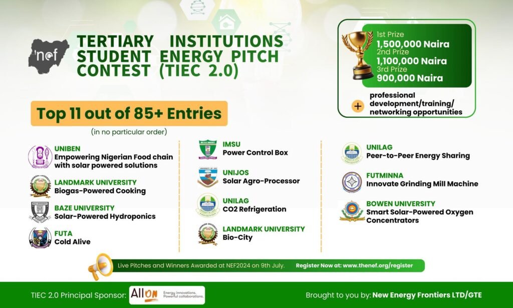 The Nigeria Energy Forum NEF group, has shortlisted 11 students’ groups across tertiary institutions in the country to for its second edition of Tertiary Institution Student Energy Pitch Challenge finals holding on July 9, 2024. This follow diligent shortlisting from over 80 entries that Submitted Pitch Deck to outline idea, problem statement, innovation potential and […]